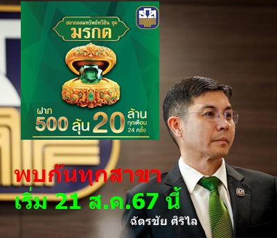 ธ.ก.ส. เพิ่มโอกาสการออมแบบรวยเหลือแจก กับสลากออมทรัพย์ทวีสิน ชุดมรกต หน่วยละ 500 บาท วงเงินรวม 1.5 แสนล้านบาท ลุ้นโชครางวัลใหญ่มูลค่า 20 ล้านบาท และรางวัลอื่นๆ รวมมูลค่า 159 ล้านบาท จำนวน 24 ครั้ง ฝากครบรับผลตอบแทน ร้อยละ 0.30 ต่อปี เตรียมเปิดรับฝากพรุ่งนี้ (17 ส.ค.ุ)เป็นวันแรก ผ่านแอปพลิเคชัน BAAC Mobile และเปิดจำหน่ายที่ ธ.ก.ส. ทุกสาขา 21 สิงหาคม ประเดิมออกรางวัลครั้งแรก 16 กันยายนนี้