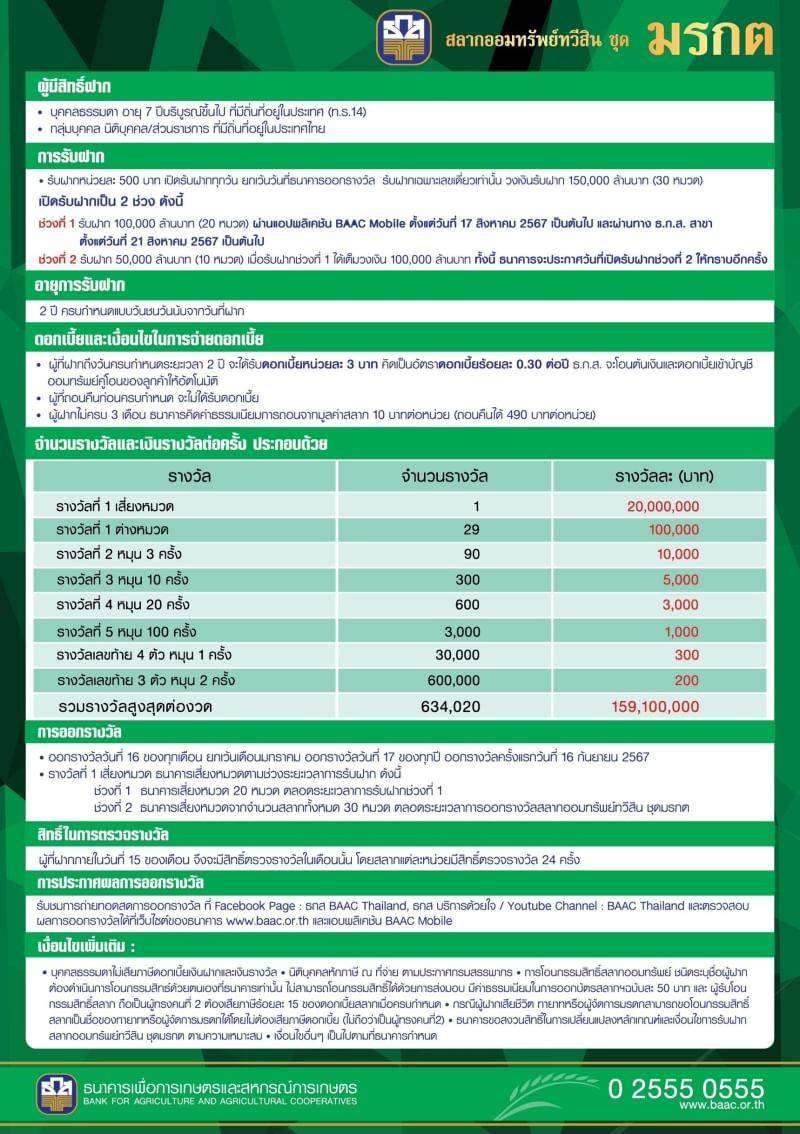 มีสิทธิ์ลุ้นรางวัลที่ 1 เสี่ยงหมวด มูลค่า 20,000,000 บาทและรางวัลอื่นๆ จำนวน 634,020 รางวัล เป็นเงิน 159,100,000 บาทต่อเดือน จำนวน 24 ครั้ง ได้แก่ รางวัลที่ 1 ต่างหมวด จำนวน 29 รางวัล รางวัลละ 100,000 บาท รางวัลที่ 2 จำนวน 90 รางวัล รางวัลละ 10,000 บาท รางวัลที่ 3 จำนวน 300 รางวัล รางวัลละ 5,000 บาท รางวัลที่ 4 จำนวน 600 รางวัล รางวัลละ 3,000 บาท รางวัลที่ 5 จำนวน 3,000 รางวัล รางวัลละ 1,000 บาท รางวัลเลขท้าย 4 ตัว จำนวน 30,000 รางวัล รางวัลละ 300 บาท และรางวัลเลขท้าย 3 ตัว จำนวน 600,000 รางวัล รางวัลละ 200 บาท ทั้งนี้ เมื่อฝากสลากฯ 500,000 บาทขึ้นไป การันตีผลตอบแทน 400 บาทต่อเดือน ผลตอบแทนรวมเมื่อครบกำหนด 12,600 บาท และยังได้รับการยกเว้นภาษีสำหรับบุคคลธรรมดาและนำไปใช้เป็นหลักประกันเงินกู้ของ ธ.ก.ส. ได้อีกด้วย