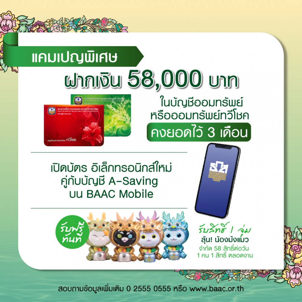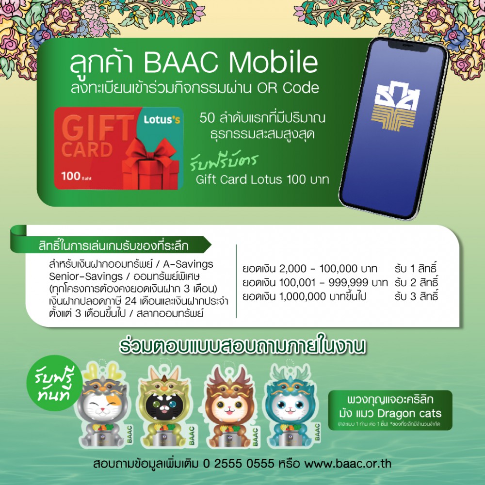 นอกจากนี้ เมื่อฝากเงินบัญชีออมทรัพย์หรือออมทรัพย์ทวีโชค ตั้งแต่ 58,000 บาทขึ้นไป และคงยอดเงินไว้ 3 เดือน หรือเปิดบัญชี A-Savings คู่กับบัตรอิเล็กทรอนิกส์บนแอปพลิเคชัน BAAC Mobile รับสิทธิ์จุ่ม มังแมว 1 ตัว หรือเมื่อฝากเงิน 1,000,000 บาทขึ้นไป และคงยอดไว้ 3 เดือน รับเลย มังแมวครบชุดทั้ง 4 ตัว หรือเมื่อสะสมยอดการทำธุรกรรมบนแอปพลิเคชัน BAAC Mobile สะสมสูงสุด 50 ลำดับแรก ตั้งแต่วันนี้จนถึง 31 ตุลาคม 2567 รับฟรี! บัตรของขวัญโลตัส มูลค่า 100 บาท (เงื่อนไขเป็นไปตามที่ธนาคารกำหนด)