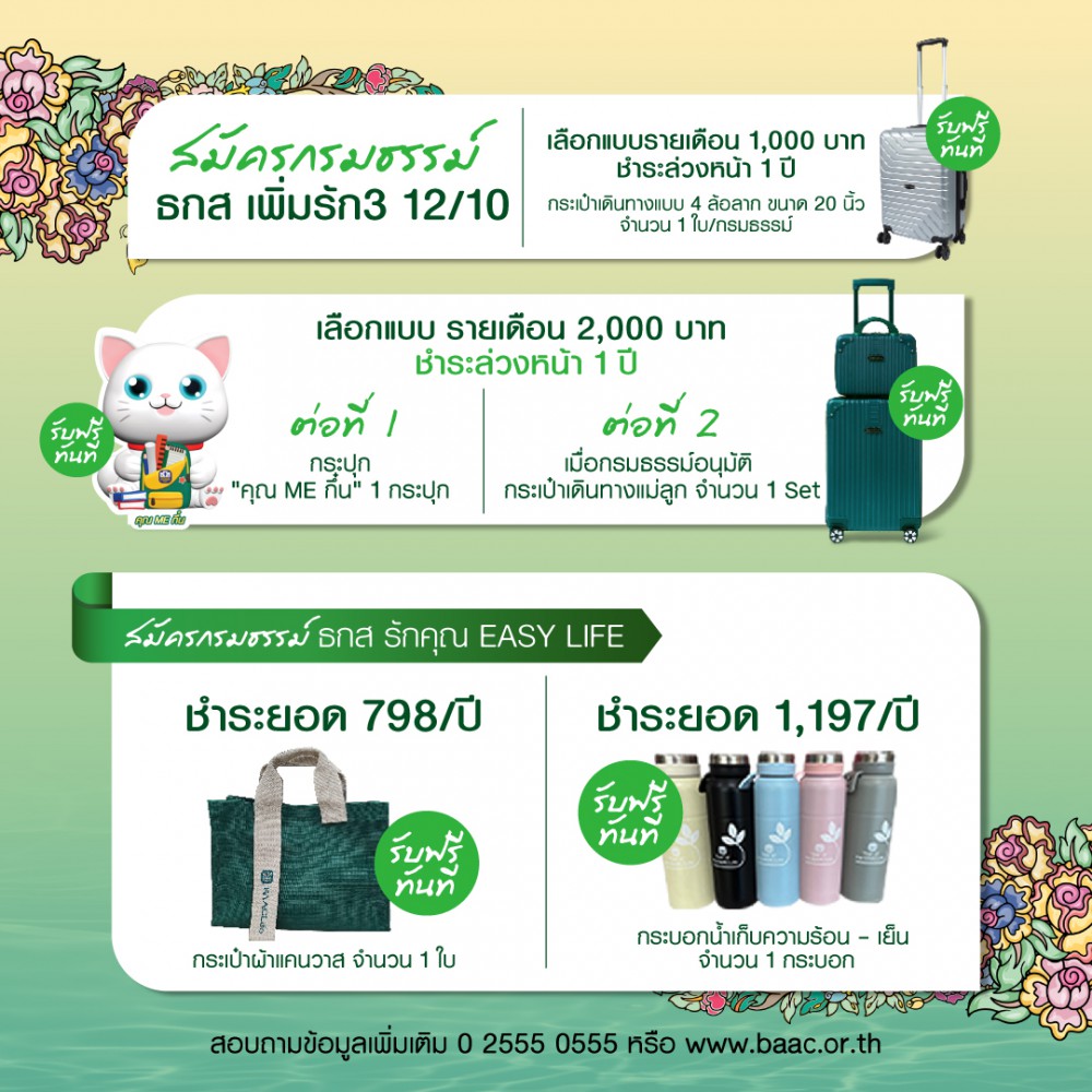 สำหรับผู้ที่กำลังมองหาผลิตภัณฑ์เงินฝากที่ให้ทั้งการออมเงิน การลดหย่อนภาษีและความคุ้มครอง สามารถเลือกผลิตภัณฑ์เงินฝากสงเคราะห์ชีวิตที่มาพร้อมโปรโมชันพิเศษมากมาย โดยสมัครกรมธรรม์ ธกส รักคุณ Easy Life และชำระยอด 1,197 บาทต่อปี รับฟรี กระบอกน้ำเก็บความร้อน – เย็น หรือชำระยอด 798 บาทต่อปี รับฟรี กระเป๋าผ้าแคนวาส หรือเมื่อสมัครกรมธรรม์ ธกส เพิ่มรัก3 12/10 และชำระล่วงหน้า 1 ปี (11,520 บาท) รับเลยกระเป๋าเดินทางแบบ 4 ล้อลาก ขนาด 20 นิ้ว จำนวน 1 ใบ/กรมธรรม์ หรือเลือกชำระรายเดือน 2,000 บาท และชำระล่วงหน้า 1 ปี จำนวน 23,040 บาท ต่อที่ 1 รับกระปุก คุณ ME กึ๋น และต่อที่ 2 เมื่อกรมธรรม์อนุมัติ รับเลยกระเป๋าเดินทางแม่-ลูก จำนวน 1 เซ็ต