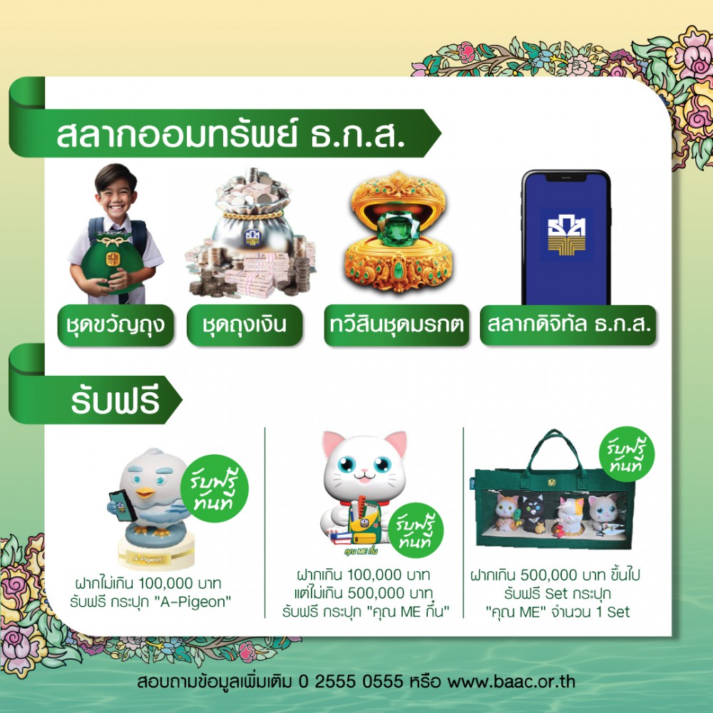 พิเศษ! เมื่อฝากสลาก ชุดมรกต ชุดถุงเงิน ชุดขวัญถุง และสลากดิจิทัล ธ.ก.ส. ตั้งแต่ 2,000 บาทขึ้นไป แต่ ไม่เกิน 100,000 บาท รับฟรี กระปุก A-Pigeon เมื่อฝากสลากฯ 100,000 – 500,000 บาท รับฟรี กระปุก คุณ ME กึ๋น และฝากเกิน 500,000 บาทขึ้นไป รับฟรี อาร์ตทอยมังแมวสุดน่ารัก 4 ตัว