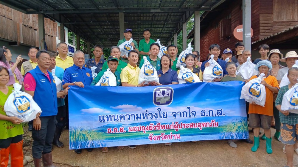 วันที่ 25 สิงหาคม 2567 ธนาคารเพื่อการเกษตรและสหกรณ์การเกษตร (ธ.ก.ส.) จังหวัดน่าน เดินหน้าให้ความช่วยเหลือผู้ประสบอุทกภัยในพื้นที่ โดยมีนายแพทย์ชลน่าน ศรีแก้ว สส.จังหวัดน่าน พร้อมด้วยสหกรณ์การเกษตรเพื่อการตลาดลูกค้า ธ.ก.ส.จังหวัดน่าน จำกัด เข้าเยี่ยมให้กำลังใจพร้อมมอบสิ่งของจำเป็นต่อการดำรงชีวิตให้แก่ผู้ประสบภัยในพื้นที่อำเภอเวียงสา จำนวน 600 ถุง เพื่อบรรเทาความเดือดร้อน โดยในส่วนของพนักงาน ธ.ก.ส. ในพื้นที่ได้ร่วมกำลังส่งน้ำดื่ม ธ.ก.ส. และจัดทำอาหารกล่อง เพื่อสนับสนุนเจ้าหน้าที่ศูนย์บรรเทาสาธารณภัยรวมถึงผู้ประสบภัยด้วย ทั้งนี้ ธนาคารจะเร่งดำเนินการให้ความช่วยเหลืออื่นๆ เพิ่มเติมผ่านมาตรการเสริมสภาพคล่องและฟื้นฟูลูกค้า สำหรับซ่อมแซมที่อยู่อาศัย โรงเรือนการเกษตร เครื่องมือ เครื่องจักรกลการเกษตร รวมถึงมาตรการฟื้นฟูการผลิตที่ได้รับความเสียหายจากภัยธรรมชาติหรือภัยพิบัติต่อไป สอบถามข้อมูลเพิ่มเติมได้ที่ Call Center 02 555 0555