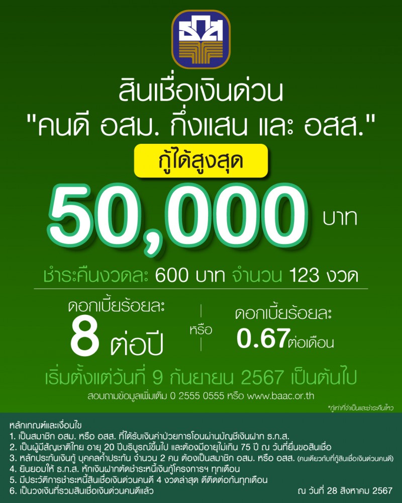 สำหรับเงื่อนไขผู้กู้ต้องเป็นสมาชิก อสม. และ อสส. ที่เคยกู้ผ่านโครงการสินเชื่อเงินด่วนคนดี และต้องถือบัตร Smart card ของ ธ.ก.ส. อายุไม่เกิน 75 ปี มีสมาชิก อสม. และ อสส. เป็นผู้ค้ำประกัน 2 คน (ต้องเป็นคนค้ำประกันรายเดิมจำนวน 1 คน) ซึ่งสมาชิกที่สนใจสามารถแจ้งความประสงค์ได้ที่ ธ.ก.ส. ทุกสาขาทั่วประเทศ เริ่มตั้งแต่วันที่ 9 กันยายน จนถึง 31 มีนาคม 2569 สอบถามข้อมูลเพิ่มเติมได้ที่ Call Center 02 555 0555