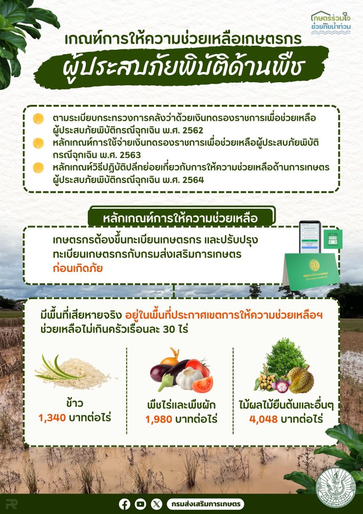 นายพีรพันธ์ คอทอง อธิบดีกรมส่งเสริมการเกษตร กล่าวว่า จากสถานการณ์อุทกภัย และปริมาณฝนที่ตกมากในพื้นที่ภาคเหนือตอนบน ภาคตะวันออกเฉียงเหนือตอนบน และภาคใต้ฝั่งตะวันออก ซึ่งเป็นสาเหตุให้เกิดน้ำท่วมฉับพลัน และน้ำป่าไหลหลาก โดยเฉพาะพื้นที่ลาดเชิงเขาใกล้ทางน้ำไหลผ่านและลุ่มน้ำ ขณะนี้ (29 ส.ค. 67) มีพื้นที่การเกษตรด้านพืช ได้รับผลกระทบ 33 จังหวัด และประกาศเขตการให้ความช่วยเหลือผู้ประสบภัยพิบัติกรณีฉุกเฉินแล้ว จำนวน 21 จังหวัด ได้แก่ มหาสารคาม อุบลราชธานี ร้อยเอ็ด พะเยา จันทบุรี พิจิตร กาญจนบุรี ตาก ปราจีนบุรี เพชรบูรณ์ กาฬสินธุ์ ตราด ขอนแก่น นครนายก แพร่ พิษณุโลก อุดรธานี เลย เชียงราย แม่ฮ่องสอน และน่าน เบื้องต้นมีเกษตรกร 112,049 ราย พื้นที่ได้รับผลกระทบ 701,525 ไร่ แบ่งเป็น ข้าว 588,231.25 ไร่ พืชไร่และพืชผัก 86,534.25 ไร่ ไม้ผล ไม้ยืนต้น และอื่นๆ 26,759.50 ไร่