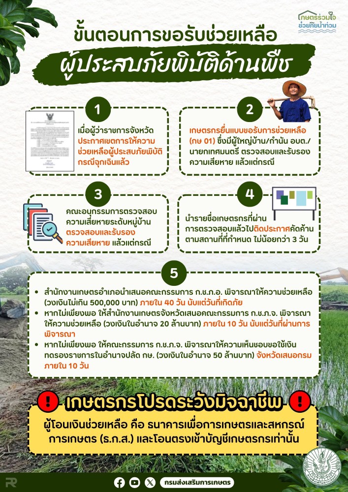 5.1 สำนักงานเกษตรอำเภอนำเสนอคณะกรรมการ ก.ช.ภ.อ. พิจารณาให้ความช่วยเหลือ (วงเงินไม่เกิน 500,000 บาท) ภายใน 40 วัน นับแต่วันที่เกิดภัย, 5.2 หากไม่เพียงพอให้ สำนักงานเกษตรจังหวัดเสนอคณะกรรมการ ก.ช.ภ.จ. พิจาณาให้ความช่วยเหลือ (วงเงินในอำนาจ 20 ล้านบาท) ภายใน 10 วัน นับแต่วันที่เกิดภัย, 5.3 หากไม่เพียงพอให้คณะกรรมการ ก.ช.ภ.จ. พิจาณาให้ความเห็นชอบ ขอใช้เงินทดรองราชการ ในอำนาจปลัดกระทรวงเกษตรและสหกรณ์ (วงเงินในอำนาจ 50 ล้านบาท) ซึ่งจังหวัดจะเสนอให้กรมพิจารณา ภายใน 10 วัน นับแต่วันที่ผ่านการพิจารณาก.ช.ภ.จ. และเสนอให้กระทรวงพิจารณา ภายใน 10 วัน นับแต่วันที่ได้รับแจ้งจากจังหวัด และเสนอปลัดกระทรวงเกษตรและสหกรณ์ พิจารณา ภายใน 10 วัน นับแต่วันที่ได้รับแจ้งจากกรม โดยเกษตรกรจะยื่นเอกสารเพียงครั้งเดียว และ ภายใน 10 วันทำการหลังจากได้รับการอนุมัติ ธ.ก.ส.จะโอนเงินเข้าบัญชีให้เกษตรกรโดยตรง ตามลำดับต่อไป ให้เกษตรกรระวังการแอบอ้างจากมิจฉาชีพหรือผู้ไม่หวังดีในการรับเงินด้วย