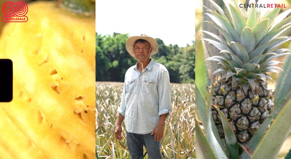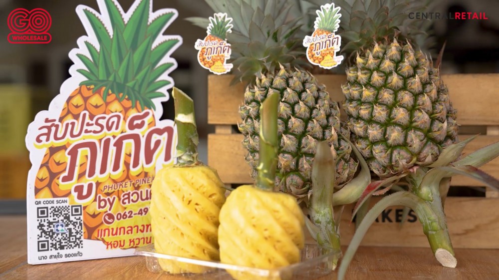 นายระวี รองเเก้ว ประธานกลุ่มวิสาหกิจชุมชนสับปะรดภูเก็ต ผู้นำผลผลิตมาจำหน่ายที่ โก โฮลเซลล์ สาขาราไวย์ เป็นช่องทางขายล่าสุด เล่าให้ฟังว่า ด้วยพื้นที่ของจังหวัดภูเก็ต เป็นเกาะ มีน้ำทะเลล้อมรอบ ทำให้ค่าดินมีความแตกต่างจากพื้นที่อื่นๆ การปลูกสับปะรดจึงต้องดูแลเอาใจใส่ ไม่ให้มีวัชพืช หากมีวัชพืชเยอะ สับปะรดก็จะไม่ได้คุณภาพ รสชาติจะไม่ผ่าน ไม่สะอาด ด้วยเหตุนี้จึงทำให้สับปะรดภูเก็ตมีรสชาติที่เป็นเอกลักษณ์ รสชาติหวาน หอม กรอบ แกนกลางทานได้ เนื้อสีเหลือง เส้นใยน้อย เหมาะสำหรับทานแบบผลสด และที่สำคัญรสชาติจะไม่กัดลิ้นผู้ที่ได้ลิ้มลอง