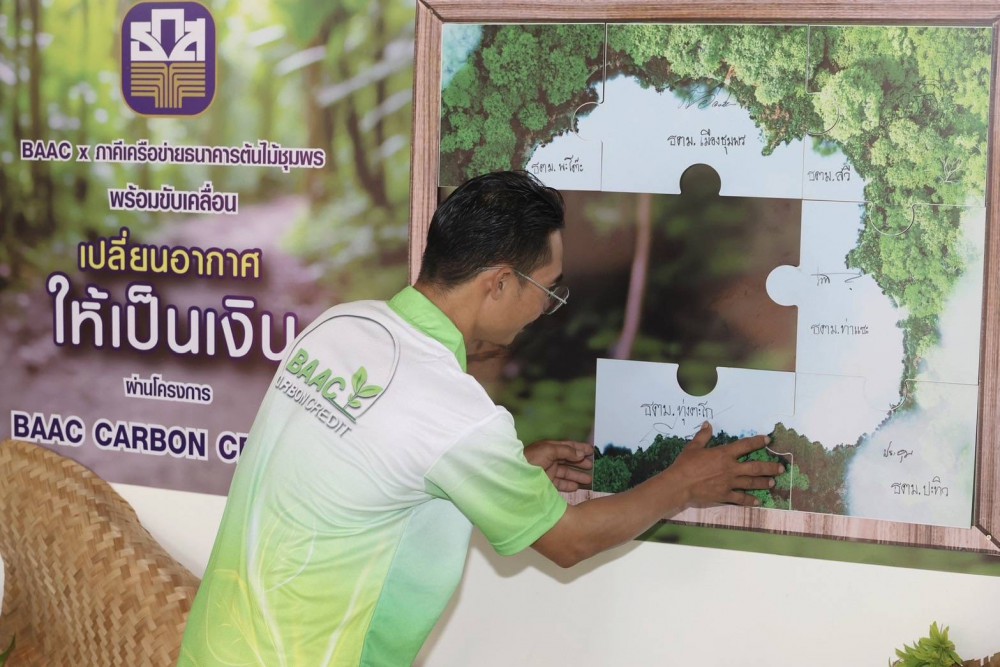 ในครั้งนี้ ธ.ก.ส. พร้อมร่วมมือกับเครือข่ายชุมชนธนาคารต้นไม้ในจังหวัดชุมพร ซึ่งเป็นต้นกำเนิดธนาคารต้นไม้แห่งแรกในประเทศไทย จำนวน 8 เครือข่าย ได้แก่ ธนาคารต้นไม้บ้านประสานมิตร ธนาคารต้นไม้บ้าน ดอนไทรงาม ธนาคารต้นไม้บ้านพะงุ้น ธนาคารต้นไม้บ้านบางฝนตก ธนาคารต้นไม้บ้านวังช้าง ธนาคารต้นไม้บ้าน คลองโซน ธนาคารต้นไม้บ้านรุ่งเรืองและธนาคารต้นไม้บ้านปากแดง มาร่วมขับเคลื่อนภารกิจการซื้อ-ขายคาร์บอนเครดิตภาคป่าไม้ผ่านโครงการ BAAC Carbon Credit โดยสนับสนุนให้เกษตรกรในชุมชนหันมาปลูกต้นไม้เพิ่มพื้นที่สีเขียวและขึ้นทะเบียนโครงการ T-VER ด้วยการตรวจนับจำนวนต้นไม้ บันทึกข้อมูลและคำนวณการกักเก็บคาร์บอนและผ่านการตรวจรับรองคาร์บอนเครดิตจากผู้ประเมินภายนอก (Validation and Verification Body: VVB)