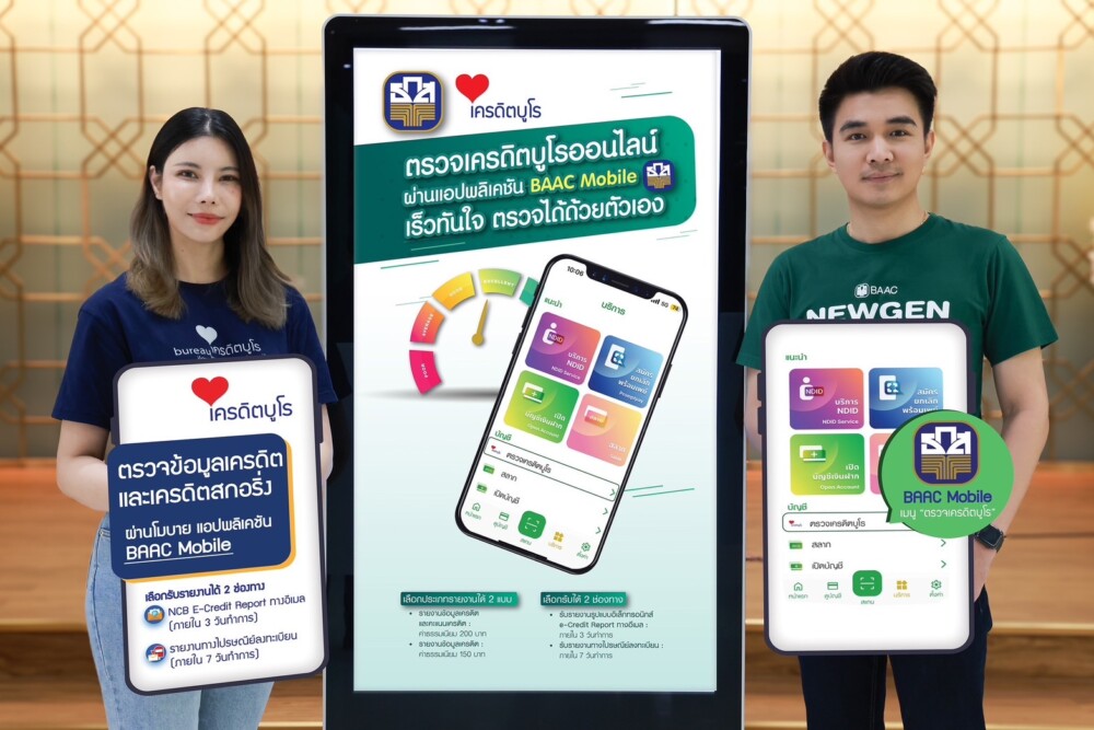ธนาคารเพื่อการเกษตรและสหกรณ์การเกษตร (ธ.ก.ส.) ร่วมกับ บริษัท ข้อมูลเครดิตแห่งชาติ จำกัด (เครดิตบูโร) ให้บริการตรวจข้อมูลเครดิตและเครดิตสกอริ่ง ผ่านแอปพลิเคชัน “BAAC Mobile” ให้ประชาชนตรวจสุขภาพทางการเงินได้ง่ายสะดวก ตอบโจทย์พฤติกรรมลูกค้ายุคดิจิทัล ครบทุกข้อมูลสินเชื่อ รู้เท่าทันและป้องกันภัยไซเบอร์ทางการเงิน เลือกรับรายงานทางอีเมลภายใน 3 วันทำการ หรือรับผลทางไปรษณีย์ภายใน 7 วันทำการ เพื่อตรวจสอบข้อมูลเครดิตของตนเอง รู้เท่าทัน สถานะทางการเงินได้แล้ววันนี้เป็นต้นไป