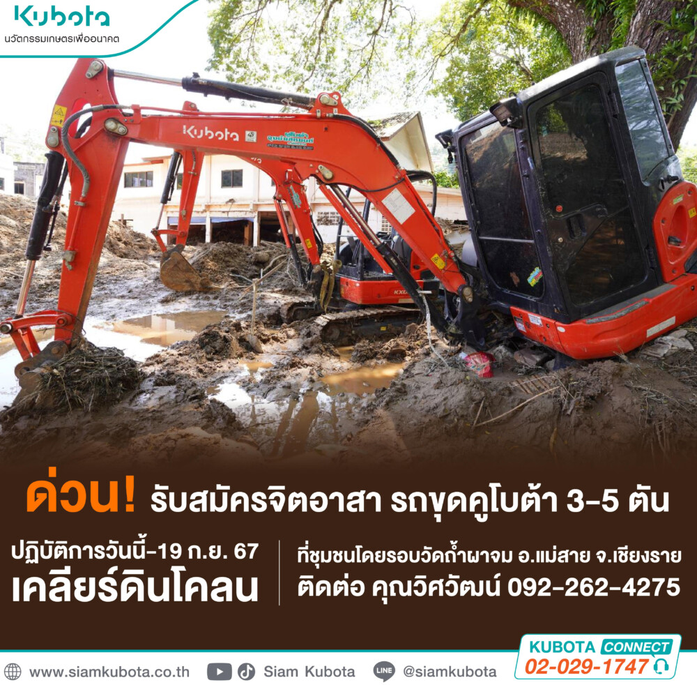 ด่วน!! สยามคูโบต้า รับสมัครจิตอารถขุดคูโบต้า 3-5 ตัน เพื่อเข้าไปช่วยเคลียร์ดินโคลน ที่ชุมชนโดยรอบวัดถ้ำผาจมที่ อ.แม่สาย จ.เชียงราย จะเริ่มปฏิบัติการในวันที่ 19 กันยายน 2567 นี้