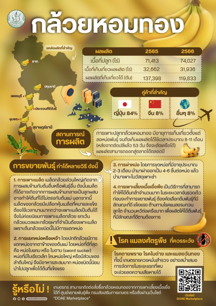 กรมส่งเสริมการเกษตร เดินหน้าส่งเสริมเทคโนโลยีการผลิตกล้วยหอมทองครบวงจร หวังพัฒนาคุณภาพผลผลิตป้อนตลาดแดนปลาดิบ ตามที่ญี่ปุ่นให้สิทธิพิเศษการยกเว้นภาษีนำเข้ากล้วยจากประเทศไทยปีละ 8,000 ตัน แต่ที่ผ่านมาเคยส่งออกสูงสุดแค่ 2,900 ตันต่อปีเท่านั้น