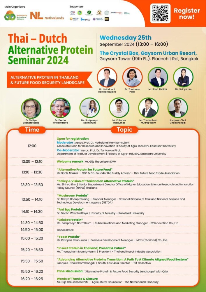 งานนี้ขอเชิญผู้ที่สนใจเข้าร่วมงานสัมมนา Thai-Dutch Alternative Protein ในหัวข้อ “โปรตีนทางเลือกในประเทศไทยและความมั่นคงทางอาหารในอนาคต” ในวันพุธที่ 25 กันยายน 2567 (13.00 – 16.30 น.) ณ The Crystal Box เกษร เออร์เบิร์น รีสอร์ท อาคารเกษรทาวเวอร์ (ชั้น 19) ถ.เพลินจิต กรุงเทพฯ จำนวนจำกัดเพียง 100 ท่านเท่านั้น ขอสงวนสิทธิสำหรับผู้ที่ลงทะเบียนล่วงหน้าเท่านั้น