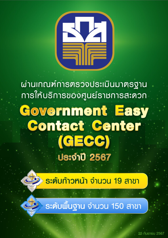 ธ.ก.ส. มุ่งพัฒนาการให้บริการสู่ความเป็นเลิศด้วยการหนุนยกระดับสาขาทั่วประเทศเข้าสู่มาตรฐาน GECC (Government Easy Contact Center) เพื่ออำนวยความสะดวกให้กับประชาชนผู้เข้ารับบริการของธนาคาร โดยในปี 2567 ธ.ก.ส. ได้รับการตรวจประเมินและให้การรับรองเพิ่มอีก จำนวน 169 สาขา