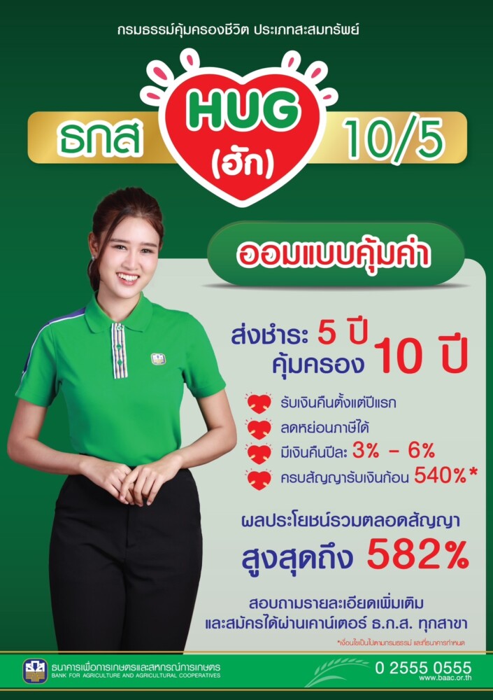 ธ.ก.ส. เปิดแคมเปญ ธกส HUG 10/5 หนุนวินัยการออมอย่างมีแบบแผนและสร้างภูมิคุ้มกันทางการเงินที่ได้รับความคุ้มครองชีวิต ฝากเริ่มต้น 10,000 บาท สูงสุดไม่เกิน 2 ล้านบาท ส่งชำระเพียง 5 ปี รับความคุ้มครองถึง 10 ปี พร้อมรับผลประโยชน์รวมตลอดสัญญา สูงสุดถึง 582% รับเงินคืนตั้งแต่ปีแรก ปีละ 3-6% และสามารถนำไปลดหย่อนภาษีได้ เปิดรับฝาก 1 ต.ค. นี้ ที่ ธ.ก.ส. ทุกสาขาทั่วประเทศ