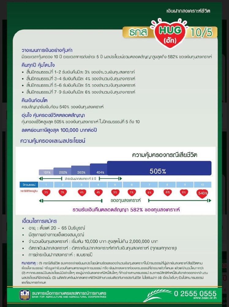 นายไพศาล หงษ์ทอง รองผู้จัดการธนาคารเพื่อการเกษตรและสหกรณ์การเกษตร (ธ.ก.ส.) เปิดเผยว่า เพื่อสนับสนุนการออมเงินอย่างมีแบบแผนและการสร้างภูมิคุ้มกันทางการเงินให้กับลูกค้า ธ.ก.ส. จัดโครงการ ธกส HUG (ฮัก) 10/5 ผลิตภัณฑ์เงินฝากสงเคราะห์ชีวิตที่ให้ความคุ้มครองชีวิต สำหรับเกษตรกรหรือครอบครัวเกษตรกร อายุ 20 – 65 ปีบริบูรณ์ ที่มีสุขภาพร่างกายแข็งแรงสมบูรณ์ โดยลูกค้าสามารถเลือกฝากเริ่มต้น 10,000 บาท สูงสุดไม่เกิน 2,000,000 บาทต่อราย