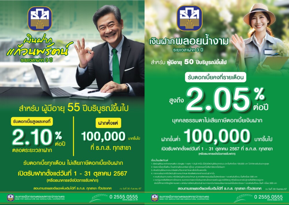 ธ.ก.ส. เปิดตัว 2 เงินฝากสำหรับวัยเลอค่า ทั้งเงินฝากแก้วนพรัตน์ สำหรับผู้เกษียณอายุ หรือ Early Retire ภายในปี 2567 และบุคคลธรรมดาที่อายุ 55 ปีขึ้นไป ฝาก 1 แสน รับดอกเบี้ยทุกเดือน 2.10% ต่อปี และเงินฝากพลอยน้ำงาม สำหรับผู้อายุ 50 ปีขึ้นไป ฝาก 1 แสน รับดอกเบี้ย 2.05% ฝาก 3 ปี รับดอกเบี้ยคงที่รายเดือนตลอดอายุการฝาก