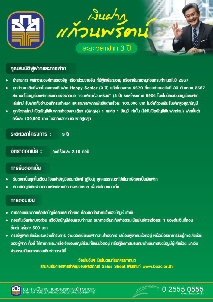 นายฉัตรชัย ศิริไล ผู้จัดการธนาคารเพื่อการเกษตรและสหกรณ์การเกษตร (ธ.ก.ส.) กล่าวว่า ธ.ก.ส. จัด 2 โครงการเงินฝากวัยเลอค่า ประกอบด้วย เงินฝากแก้วนพรัตน์ วงเงินรับฝาก 20,000 ล้านบาท สำหรับบุคคลธรรมดาที่ เกษียณอายุ หรือ Early Retire ภายในปี 2567 และบุคคลธรรมดาที่อายุ 55 ปีขึ้นไป เปิดฝากขั้นต่ำ 100,000 บาท ไม่จำกัดวงเงินรับฝากสูงสุด ระยะเวลา 3 ปี รับดอกเบี้ยเป็นรายเดือนร้อยละ 2.10 ต่อปี จำกัด 1 คนต่อ 1 บัญชี