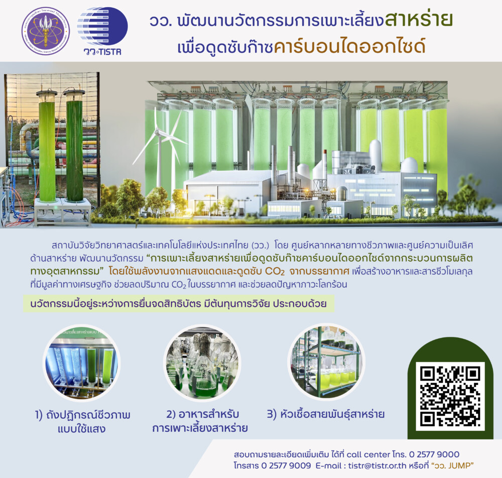 หลังจากที่สถาบันวิจัยวิทยาศาสตร์และเทคโนโลยีแห่งประเทศไทย (วว.) กระทรวงการอุดมศึกษา วิทยาศาสตร์ วิจัยและนวัตกรรม (อว.) ได้จัดตั้ง ศูนย์ความเป็นเลิศด้านสาหร่าย (ALEC) ซึ่งเป็นหน่วยงานในสังกัด ที่เป็นศูนย์ความหลากหลายทางชีวภาพ มีภารกิจดำเนินงานด้านสาหร่ายอย่างครบวงจร ได้แก่ วิจัย พัฒนา ถ่ายทอดเทคโนโลยี และบริการด้านสาหร่ายน้ำจืดมากกว่า 30 ปี ตั้งแต่ต้นน้ำ กลางน้ำ และปลายน้ำ ล่าสุดการดำเนินโครงการประสบผลสำเร็จในการพัฒนานวัตกรรมของผลงาน คือ การพัฒนาระบบการเพาะเลี้ยงสาหร่ายในบ่อและระบบปิด ที่สามารถควบคุมปัจจัยต่างๆ เช่น แสง อุณหภูมิ และแหล่งสารอาหาร ทำให้สามารถเพิ่มผลผลิตและคุณภาพของสารชีวโมเลกุลที่ได้จากกระบวนการ ในการพัฒนาการเพาะเลี้ยงสาหร่ายเพื่อดูดซับก๊าซคาร์บอนไดออกไซด์จากกระบวนการผลิตทางอุตสาหกรรม