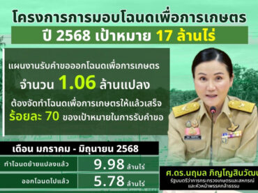 “นฤมล” โชว์ตัวเลขมอบโฉนดเพื่อเกษตรครึ่งปีแรก แจกแล้ว 5.78 ล้านไร่ มั่นใจครบ 17 ล้านไร่ในปีนี้ มิถุนายน 15, 2025kasettumสถานีข่าววันนี้, ใคร ทำอะไร ที่ไหนกระทรวงเกษตรฯ, เกษตรทำกิน, เป้าแจกโฉนดเพื่อการเกษตร, แจกโฉนดครึ่งปีแรก, แจกโฉนดเพื่อการเกษตร