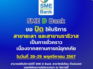 SME D Bank ขอแจ้งปิดให้บริการสาขายะลา-สาขานราธิวาส เป็นการชั่วคราว เนื่องจากสถานการณ์อุทกภัยในพื้นที่
