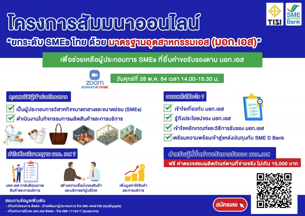 ธนาคารพัฒนาวิสาหกิจขนาดกลางและขนาดย่อมแห่งประเทศไทย (ธพว.) หรือ SME D Bank จับมือ สำนักงานมาตฐานผลิตภัณฑ์อุตสาหกรรม (สมอ.) จัดโครงการอบรมสัมมนาออนไลน์ “ยกระดับ SMEs ไทย ด้วยมาตรฐานอุตสาหกรรมเอส (มอก.เอส)” ให้ความรู้เกี่ยวกับ มอก.เอส ไม่ว่าจะเป็นด้านประโยชน์ หลักเกณฑ์และวิธีการรับรองตาม มอก.เอส