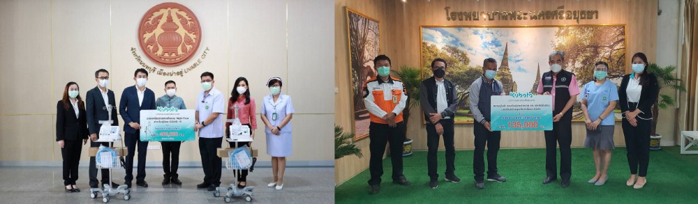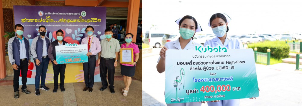 โดยเมื่อเดือนพฤษภาคมที่ผ่านมา สยามคูโบต้า ได้ดำเนินการมอบเครื่องช่วยหายใจ High Flow ให้แก่ โรงพยาบาลในจังหวัดที่มีการแพร่ระบาดสูงสุด 5 แห่ง ได้แก่ โรงพยาบาลปทุมธานี จังหวัดปทุมธานี โรงพยาบาลสมเด็จพระนางเจ้าสิริกิติ์ พร. จังหวัดชลบุรี โรงพยาบาลมหาราชนครเชียงใหม่ จังหวัดเชียงใหม่ โรงพยาบาลบางใหญ่ จังหวัดนนทบุรี และโรงพยาบาลบางพลี จังหวัดสมุทรปราการ มูลค่ารวม 2 ล้านบาท นอกจากนี้ยังได้ร่วมกับคู่ค้าทางธุรกิจทั้งผู้แทนจำหน่ายสยามคูโบต้า ผู้ผลิตชิ้นส่วน รวมถึงพนักงานสยามคูโบต้า บริจาคเงินสมทบทุน รวมเป็นเงิน 4 ล้านบาท เพื่อจัดซื้อเครื่องช่วยหายใจ High Flow Oxygen อีก 18 เครื่อง และ ชุด PAPR รวม 49 ชุด ส่งมอบไปยังโรงพยาบาลที่ขาดแคลน 20 แห่งทั่วประเทศ ซึ่งได้ทำการส่งมอบไปยังโรงพยาบาลเป้าหมายแล้วบางส่วน และมีกำหนดเสร็จสิ้นภายในเดือนกรกฎาคมนี้ เพื่อนำไปใช้ให้เกิดประสิทธิภาพสูงสุดในการช่วยเหลือผู้ป่วยโควิด-19 ที่จำเป็นต้องใช้เครื่องช่วยหายใจ และป้องกันการติดเชื้อจากการปฏิบัติงานของบุคลากรทางการแพทย์