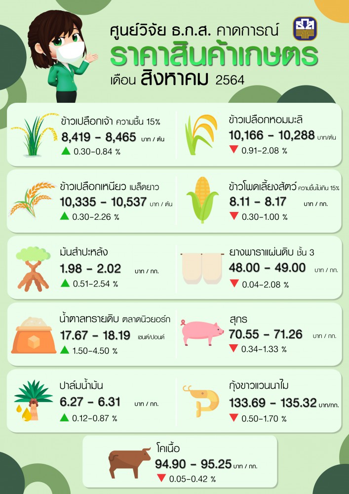 ศูนย์วิจัยและพัฒนานวัตกรรม ธ.ก.ส. ชี้ผลจากปัญหาภัยธรรมชาติของประเทศคู่ค้าและมาตรการล็อกดาวน์จากสถานการณ์การแพร่ระบาดของเชื้อไวรัสโควิด-19 ในประเทศ ทำให้ราคาสินค้าเกษตรเดือนสิงหาคม 2564 ได้แก่ ข้าวเปลือกเจ้า ข้าวเปลือกเหนียว มันสำปะหลัง น้ำตาลทรายดิบ และปาล์มน้ำมันมีแนวโน้มราคาเพิ่มขึ้น ด้านข้าวเปลือกหอมมะลิ ข้าวโพดเลี้ยงสัตว์ ยางพาราแผ่นดิบ สุกร กุ้งขาวแวนนาไม และโคเนื้อมีแนวโน้มราคาปรับลดลง