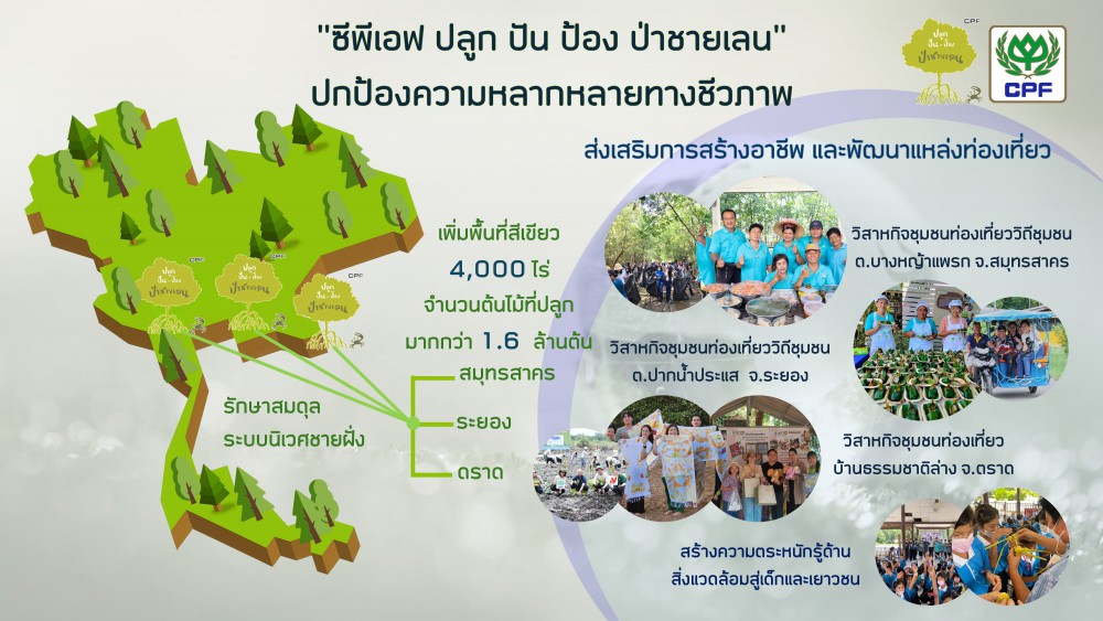 ตั้งแต่ปี 2557 จนถึงปัจจุบัน ซีพีเอฟดำเนินโครงการ “ซีพีเอฟ ปลูก ปัน ป้อง ป่าชายเลน”อนุรักษ์ ฟื้นฟู และปลูกป่าใหม่เพิ่มเติมจำนวน 4,000 ไร่ คิดเป็นจำนวนต้นไม้ที่ปลู กมากกว่า 1.6 ล้านต้น ในพื้นที่ยุทธศาสตร์ 5 จังหวัด คือ ระยอง สมุทรสาคร ชุมพร สงขลา และพังงา